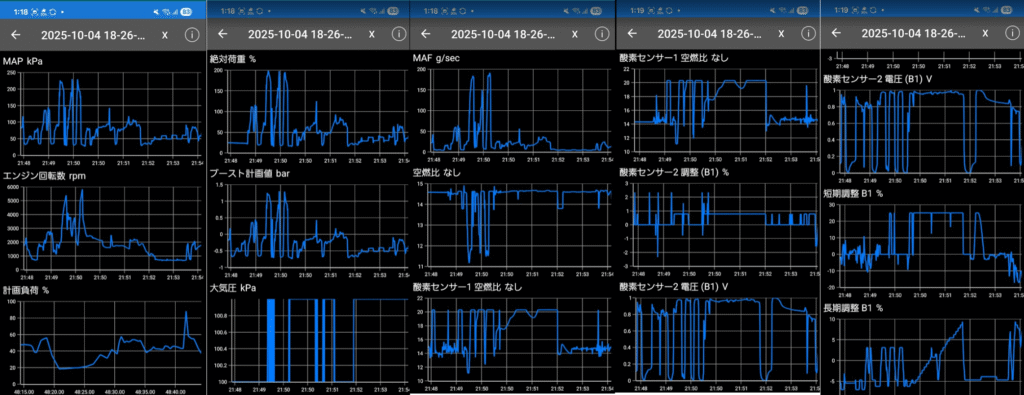 実際に走行してみると、加速中やアイドリングでFuel Trim(燃料補正)がどう変わるかが見えてくる。数字が動くたびに、エンジンの内部で何が起きているのかが可視化されます。これは面白い。