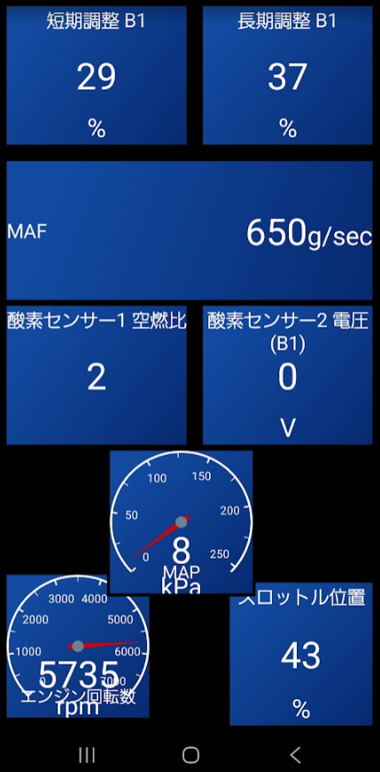 無事接続されると、車のセンサー値がリアルタイムで表示されます。