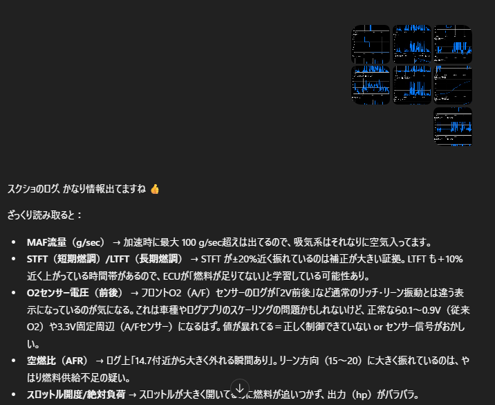 症状に合わせて、どのようなセンサーのデータを取ればよいかもChatGPTが教えてくれました。ご自分の車のメンテナンスを自分で行う方にはあると非常に便利なツールだと感じました。